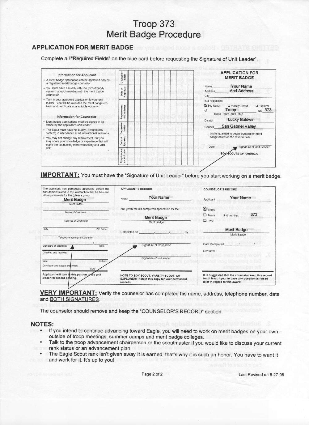 It is the Scout's responsibility to complete all required (highlighted, see below) fields on the merit badge application - blue card (see illustration on page 2 below) before requesting a Scoutmaster's signature. Scoutmaster (or ASM) may want to check that: The Scout is not working on too many Merit Badges at once or check that prerequisites - precondition must be done first or that a Scout is ready for the MB. The First Aid Merit Badge is needed before some other Merit Badges can be worked on. Once you have the "Signature of Unit Leader" 4. Find a Merit Badge Counselor After your leader signs your card: Contact and get a merit badge counselor from the Troop 373's Merit Badge Counselors Chair (or Advancement Chairman or the Scoutmaster). If no counselors are available within the troop, the Troop may give you a list of District Merit Badge counselors. Current Troop Merit Badge Counselor Chair is:
