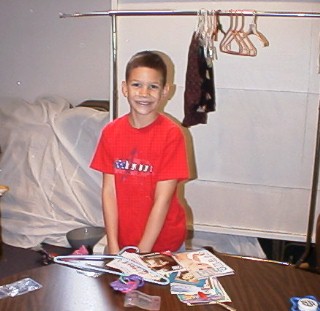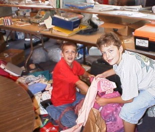 Parent and Children Volunteers bag clothes, box hangers, pick up trash, and move some goods across the south parking lot.